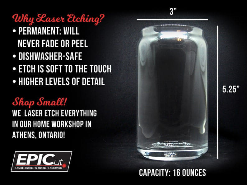 16oz Personalized Beer Can Glass, custom laser etched with your design! Perfect for wedding favours, groomsmen gifts, Father's day or any other occasion! Custom engraved glassware is also a great opportunity to brand your restaurant or cafe.
