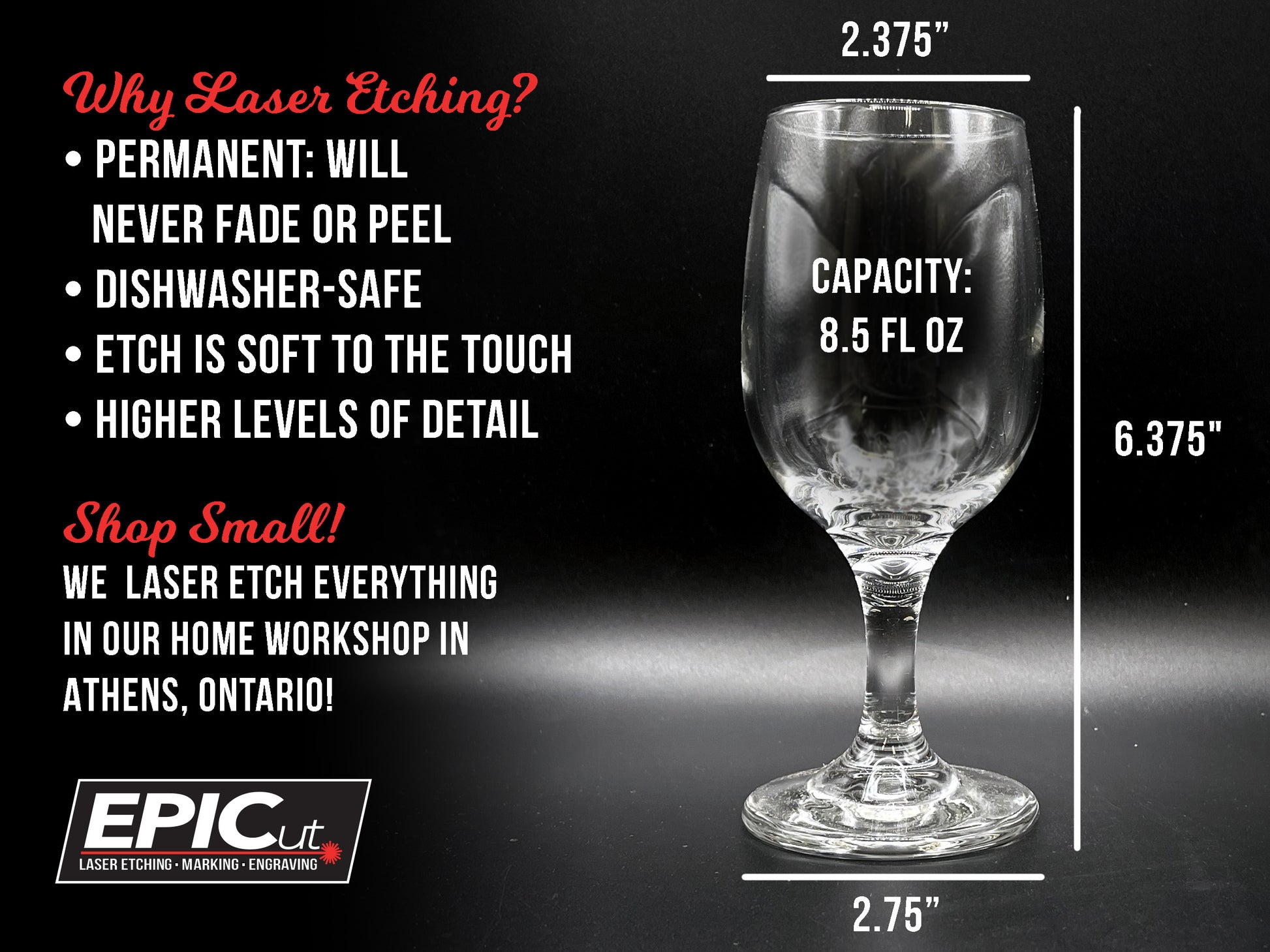 8.5oz Personalized Small Stemmed Wine Glass, custom laser etched with your design! Perfect for weddings, corporate events, adding a special touch to celebrations, or any other occasion! Custom engraved glassware is also a great opportunity to brand your restaurant or cafe.