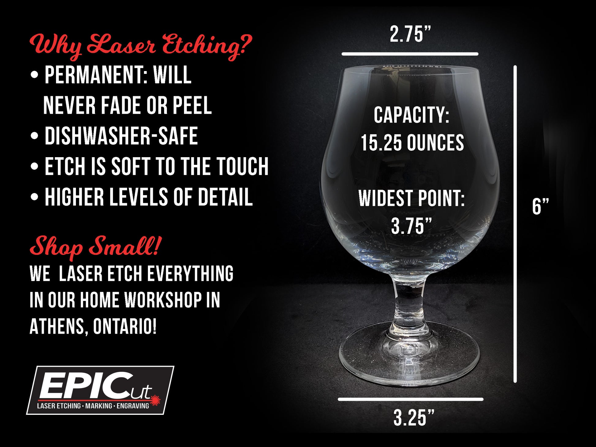 >>> Need 12? Or 100? Contact me for quantity discounts! Please note it is NOT possible to modify the colour of the etch. We use laser engraving, which works by removing the top layer of the material being engraved. Etches on glassware will look frosted, and will never fade! Please see our FAQ for more details on laser engraving, and flip through the product photos & our customer reviews for photos of actual etched glasses!