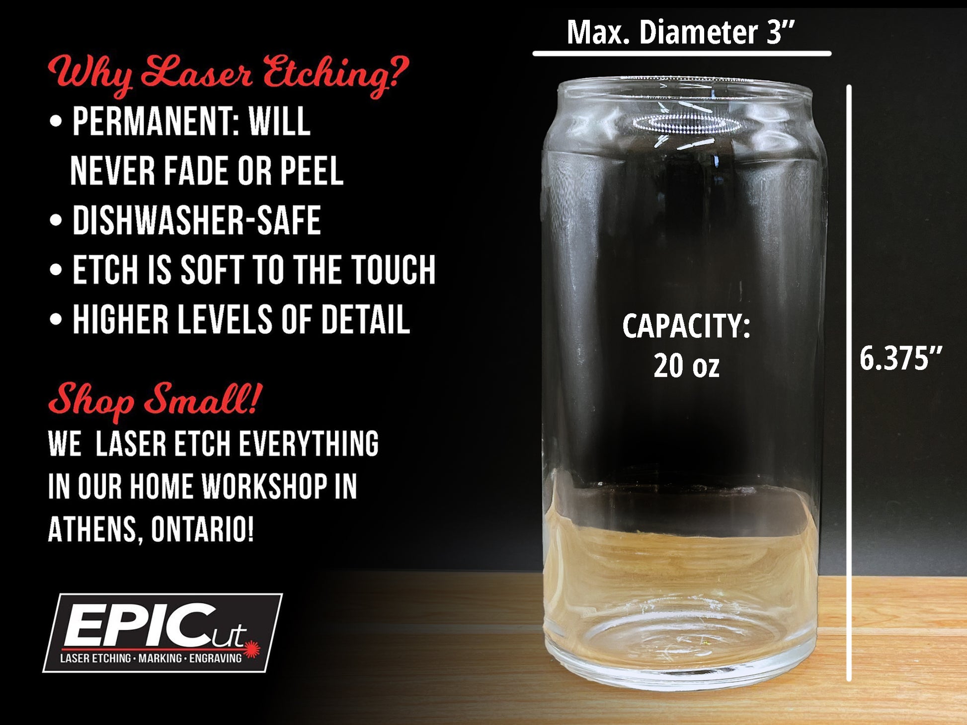Also available in a smaller 16 oz size: https://epicut.ca/collections/glassware/products/custom-16oz-can-glass